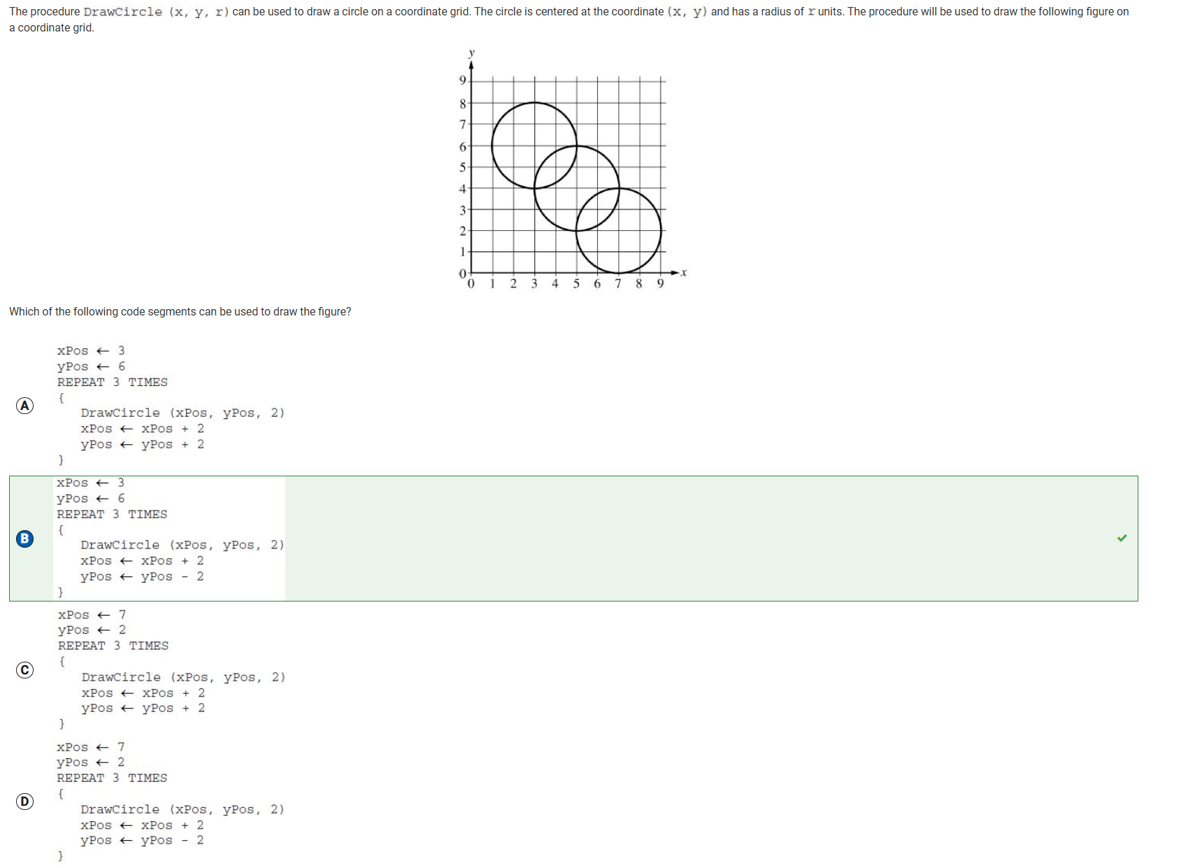 My answer is right because it starts at (3,6), and it draws a circle with raiud 2, and moves the circle right 2 and down 2, and repeats this thrice. Repeating this procedure by hand would result in the same graph being drawn.