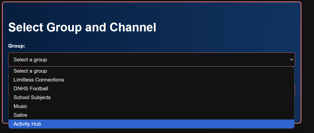 When a user selects a group from the group_id dropdown, the fetchChannels() function is called. This function sends a POST request to the backend filtered API endpoint (/api/channels/filter) and includes the selected group’s name in the request body. The backend returns a filtered list of channels associated with that group. The function processes the response and repopulates the channel_id dropdown with new <option> elements, which allowed users to choose from channels specifically linked to their selected group. This dynamic update ensures the channel list remains relevant and specific to the user’s choice.