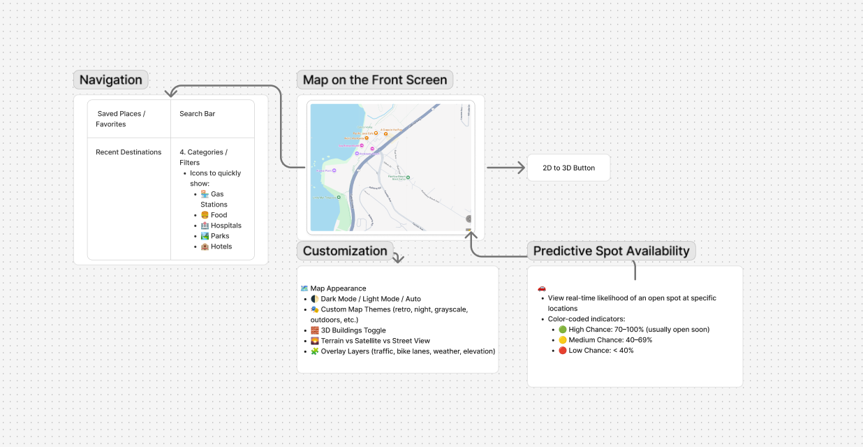 - Prediction Heatmap: A real-time visual showing the likelihood of available meters in color-coded zones.